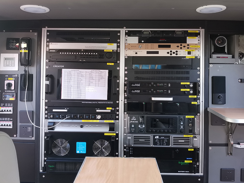 車內(nèi)平臺按功能分為三段,前部駕駛艙、中部操作艙、后部設(shè)備艙;操作艙設(shè)有兩個可旋轉(zhuǎn)座椅,方便進(jìn)行通信設(shè)備操作;后部設(shè)備艙可配備電纜盤、發(fā)電機(jī)控制單元、UPS主機(jī)、蓄電池、雜物柜,設(shè)備配重布局合理,安裝平衡穩(wěn)固。