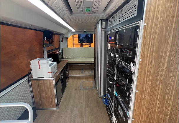 該應(yīng)急移動(dòng)指揮車具備衛(wèi)星通信、單兵自組網(wǎng)、專網(wǎng)通信、無(wú)人機(jī)圖傳、仿生機(jī)器人、指揮調(diào)度、信息采集、信息處理、集中控制、音視頻圖傳、視頻會(huì)議、廣播系統(tǒng)、供電、照明、生活保障等多種功能。