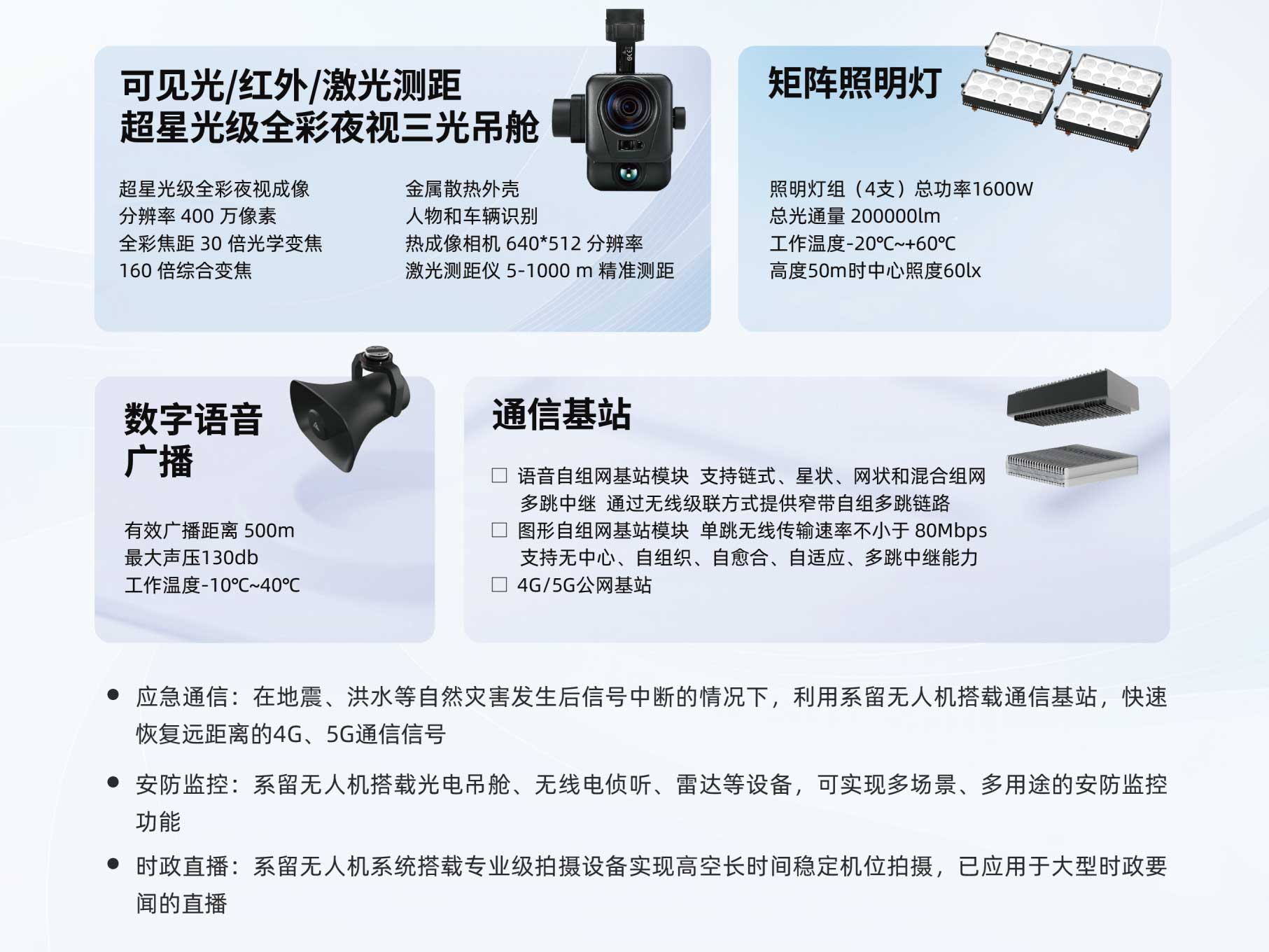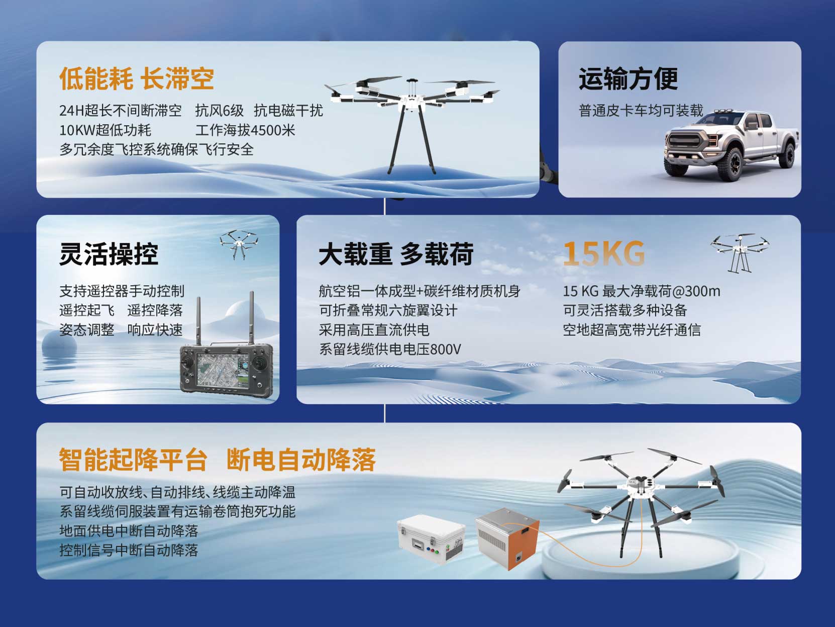 系留無人機(jī):24H超長(zhǎng)不間斷滯空、抗風(fēng)6級(jí)、抗電磁干擾、10KW超低功耗、工作海拔4500米、多冗余度飛控系統(tǒng)確保飛行安全;