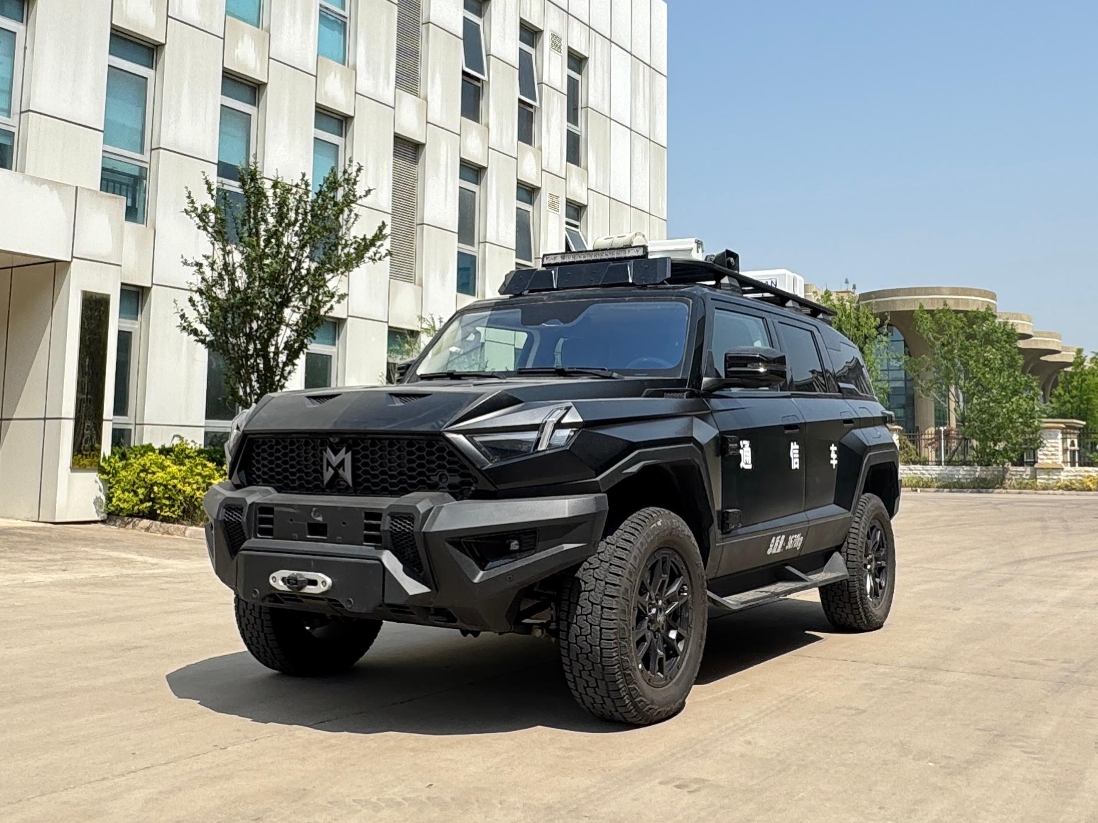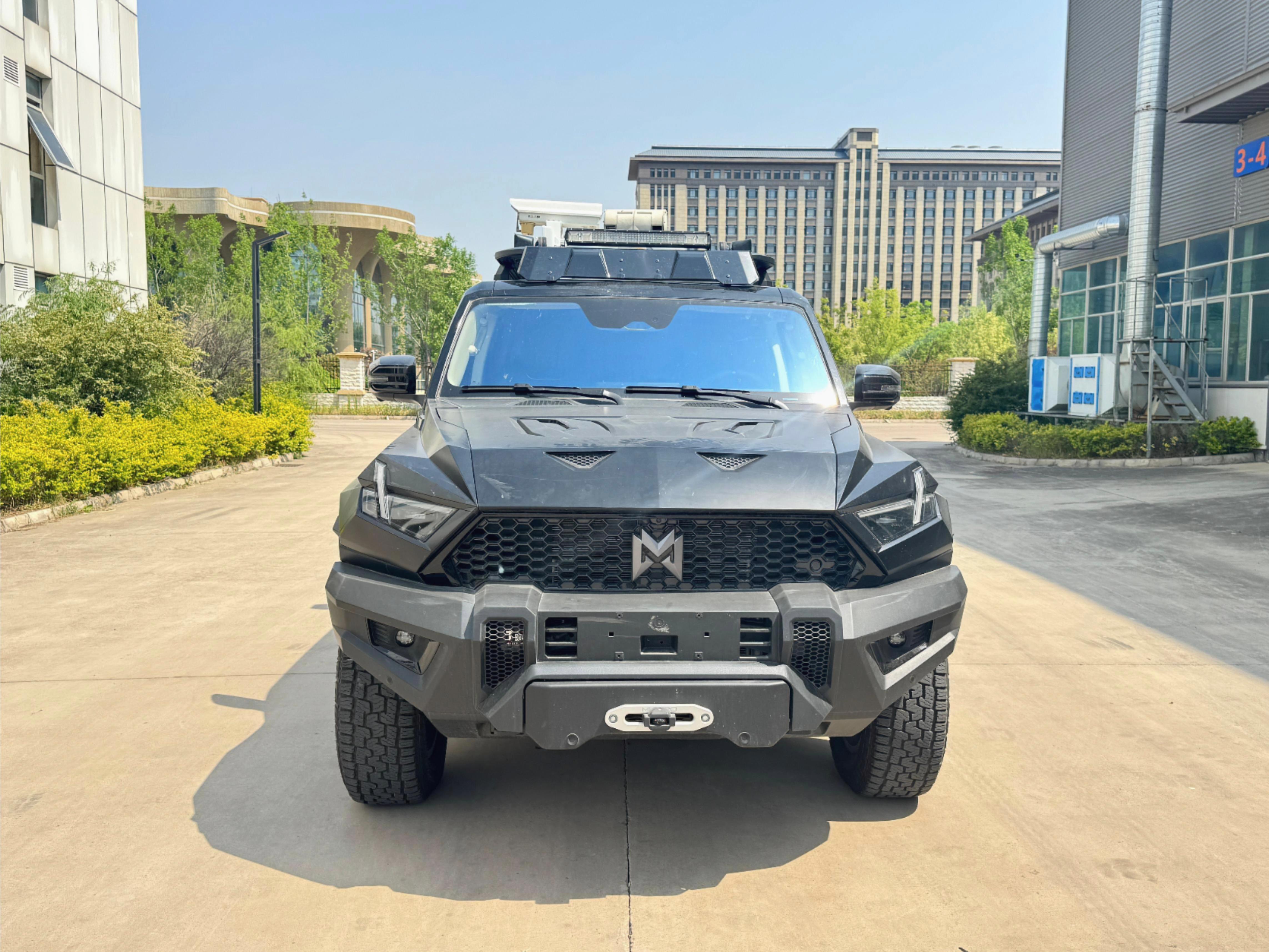 動力系統(tǒng)采用增程式混合動力,能輸出最大816匹馬力和1050N·m的最大扭矩,續(xù)航里程可達600km,可滿足長距離、高強度任務需求。車輛整備質量3500kg,尺寸為長5096mm、寬2080mm、高2314mm,軸距2950mm。此外,車輛滿足公安B級防爆標準,配備防爆涂層、TPE玻璃防爆膜和防爆胎等,安全性高。